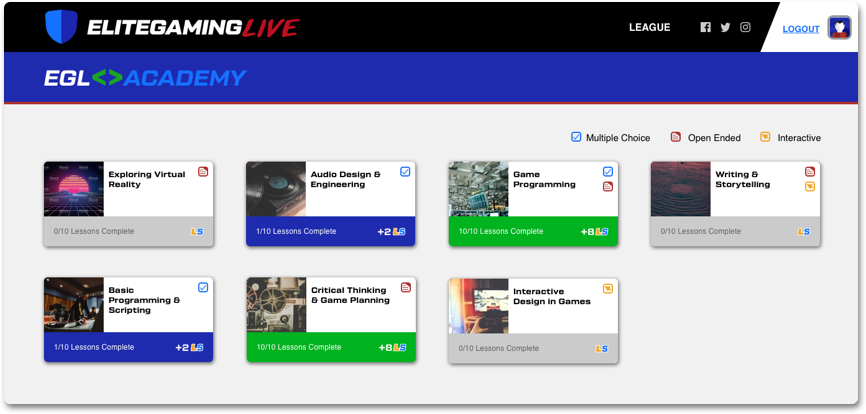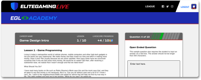 Students earn LiveScore points by gaming & learning through EGL Academy.